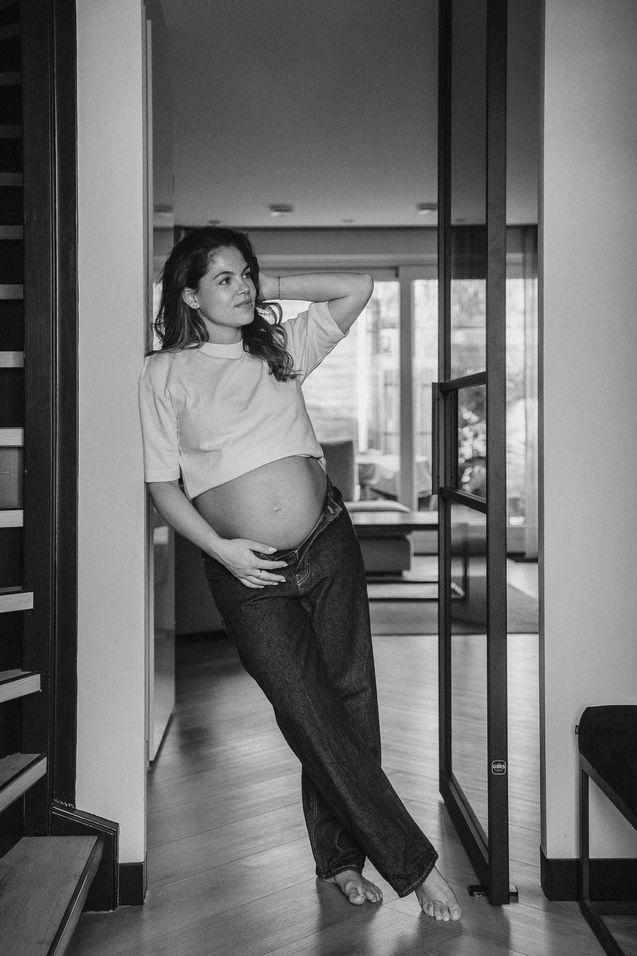 Geen standaard happy plaatjes buiten, maar een zwangerschapsshoot binnen. Relaxed en helemaal eigen. Een shoot die laat zien dat je vooral moet doen wat bij jullie past, en dat levert altijd de mooiste beelden op.